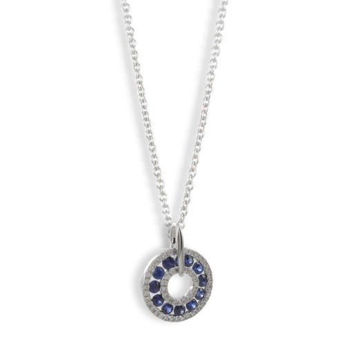 Penjoll rodó en or blanc de 18 kilates de 13 mil·límetres de diàmetre amb 11 safirs de 0,49 kilates de pes total i 2 orles de 49 diamants naturals talla brillant amb un pes total de 0,149 kilates. La cadena es ven per separat.