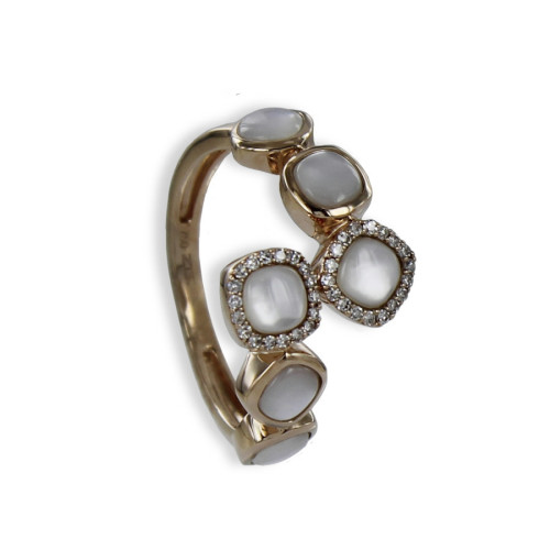 Anell creuat en or rosa de 18 quilats amb 6 peces de nacre i 2 orles amb 36 diamants naturals talla brillant de 0,102 quilats de pes total.