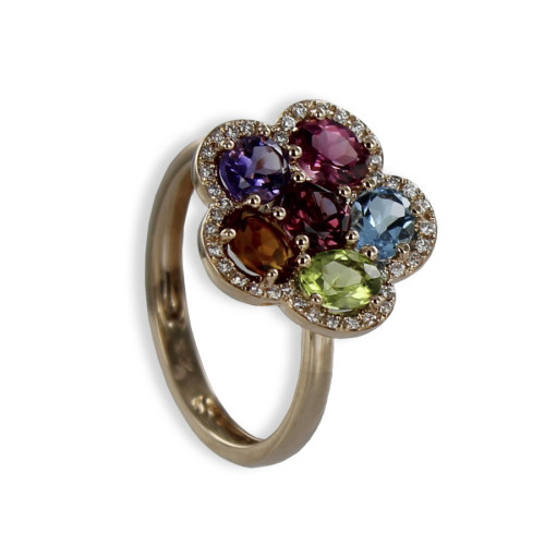 Anell en or rosa de 18 kilates flor de 5 pètals i 1,5 centímetres de diàmetre aproximat amb centre de rodolita i pètals d'ametista, topazi blau, citrí, peridot i turmalina rosa, orla de 40 diamants naturals talla brillant amb un pes total de 0,15 ktes.