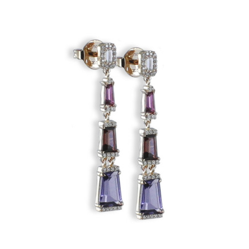 Arracades en or rosa de 18 quilats llargues de 3 centímetres aproximats amb 68 diamants naturals de 0,20 quilats de pes total, 2 ametistes de 1,527 quirats de pes total, 2 granats de 0,768 quilats de pes total i 2 turmalines roses de roses. Tancament pressió.