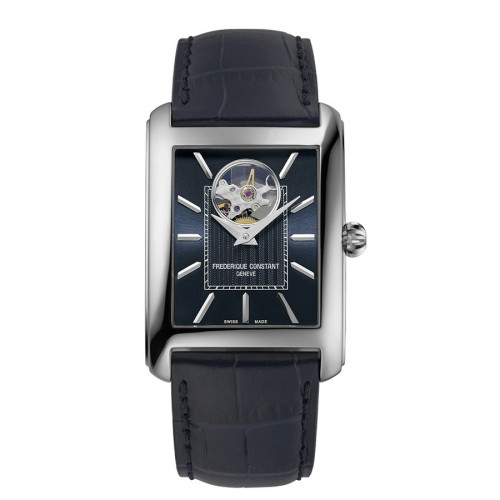 Frederique Constant Classics Carree Heart watch, automatic movement, 30 x 34 millimeter steel case with transparent back, sapphire crystal, blue dial, indices and blue leather strap.