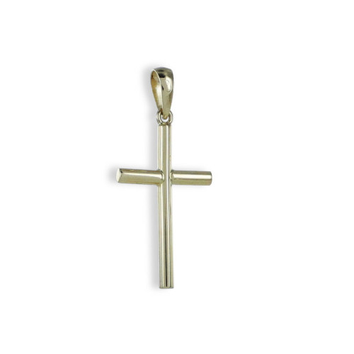 Elegante cruz en oro amarillo de 18 quilates (750 milésimas), diseñada con acabado en tubo redondo, que aporta mayor volumen, brillo y presencia a la pieza.
