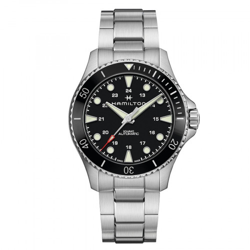 Reloj Hamilton Khaki Navy Scuba, movimiento automático, caja de acero de 43 milímetros de diámetro con el bisel giratorio negro, esfera negra, índices luminiscentes, segundero y brazalete de acero.