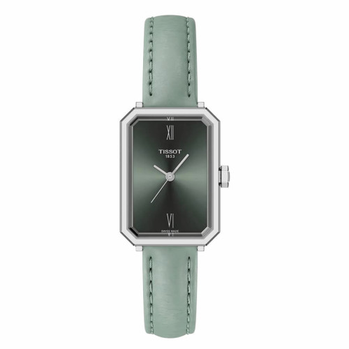 Reloj Tissot SRV, movimiento de cuarzo, caja rectangular de acero de 30 x 21,8 milímetros, cristal zafiro, esfera verde, números romanos, segundero y correa de piel verde.
